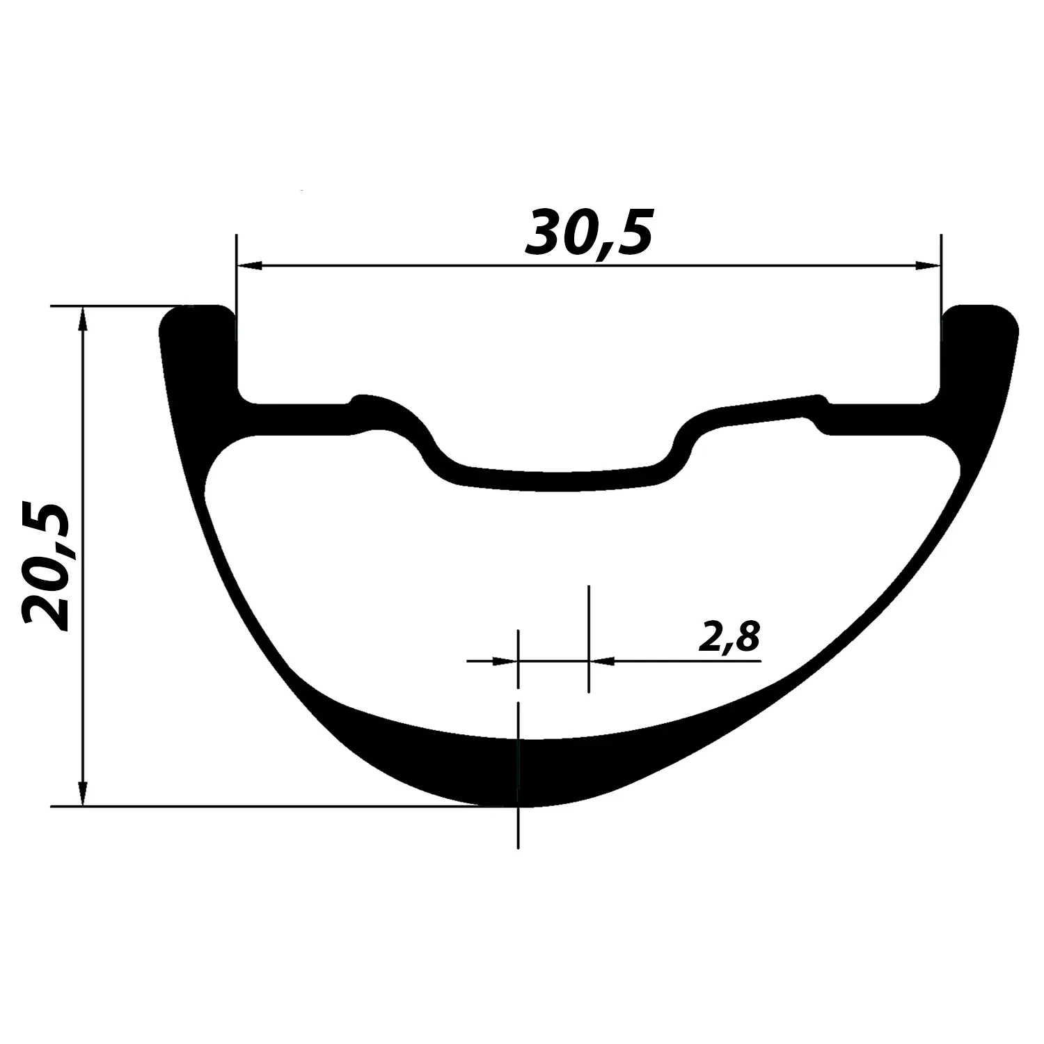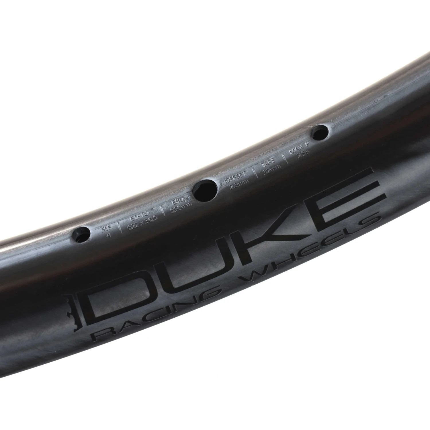 Terwijl de constructie de nodige weerstand garandeert, helpt het carbon fabricageproces om het gewicht merkbaar te verminderen. Bovendien wordt de laterale stijfheid van DUKE’s lichtste 29 inch velg tot nu toe verhoogd door het Hookless Design en het asymmetrische profiel met 2,4 of 2,8 mm Offset. Vergeleken met een standaard carbon velg met haken biedt het Hookless Design ook meer robuustheid en schokbestendigheid.