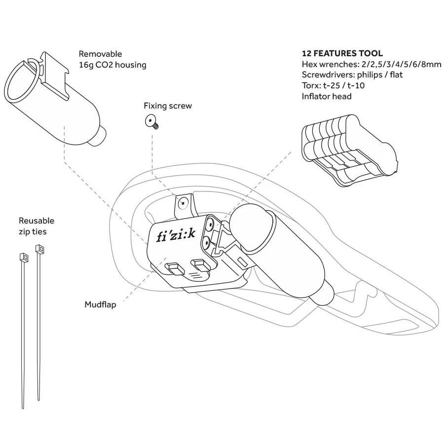 Het Fizik Terra Alpaca X5 mountainbikezadel combineert ondersteuning en controle – bergop en bergaf. In de set met de speciaal voor de MTB-zadels Terra en Gravita ontwikkelde gereedschapsdrager bent u ook op de trails gewapend. De multi-tool bevat 12 functies, een opblaaskop en twee verwijderbare 16g CO2 patroonbehuizingen. De drager wordt in de onderkant van het zadel gestoken en vastgezet met een bevestigingsschroef. Eenmaal geïnstalleerd past de drager volledig in het silhouet van het zadel en zit hij niet in de weg tijdens het rijden.