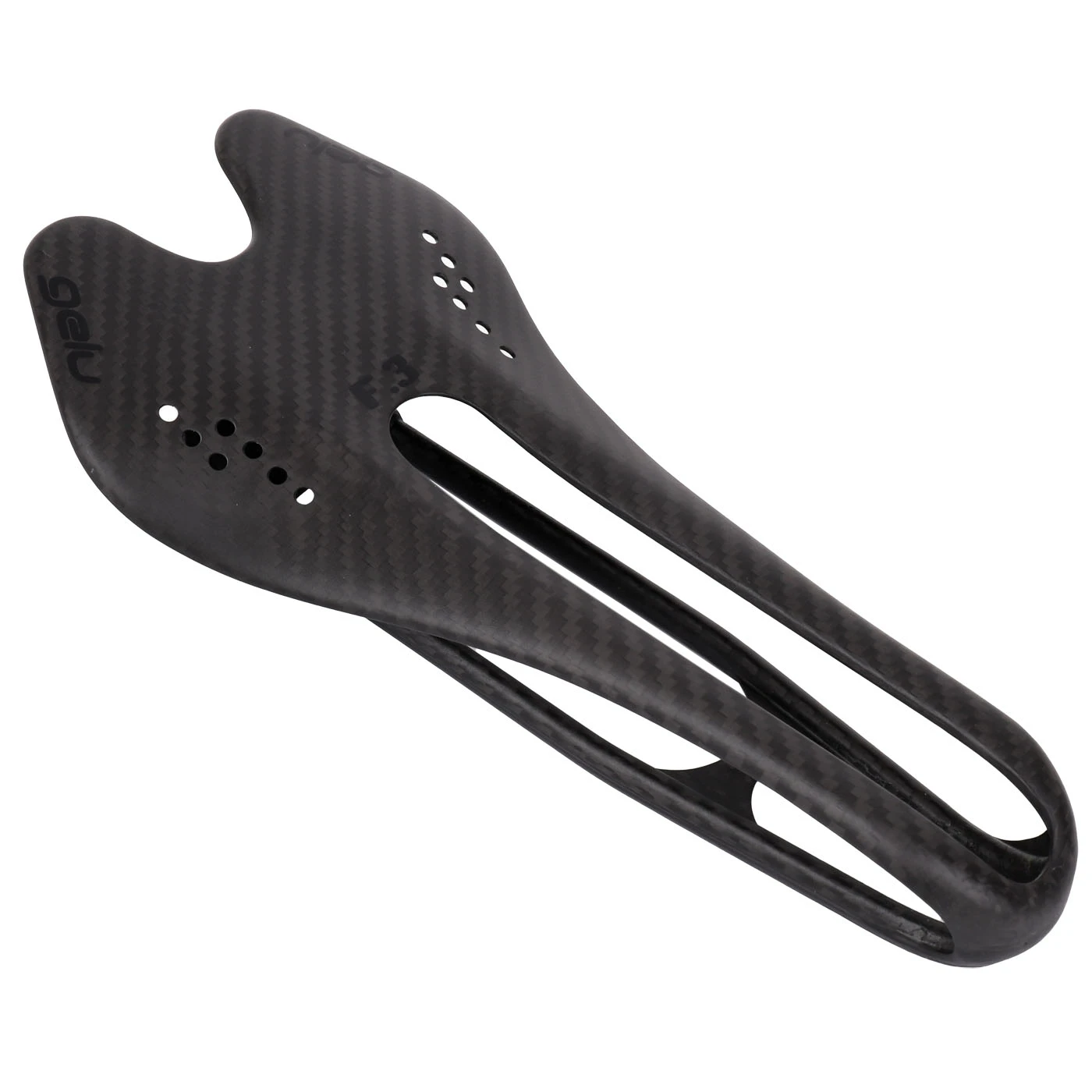Met een gewicht van slechts 75 gram is de Gelu F3 . Dit wordt bereikt dankzij zijn constructie die volledig uit koolstofvezel bestaat! Alles, van het zadelframe met geïntegreerde veer tot het bovenstuk, is gemaakt . De F3 weegt minder dan 80 gram, heeft een en geen .