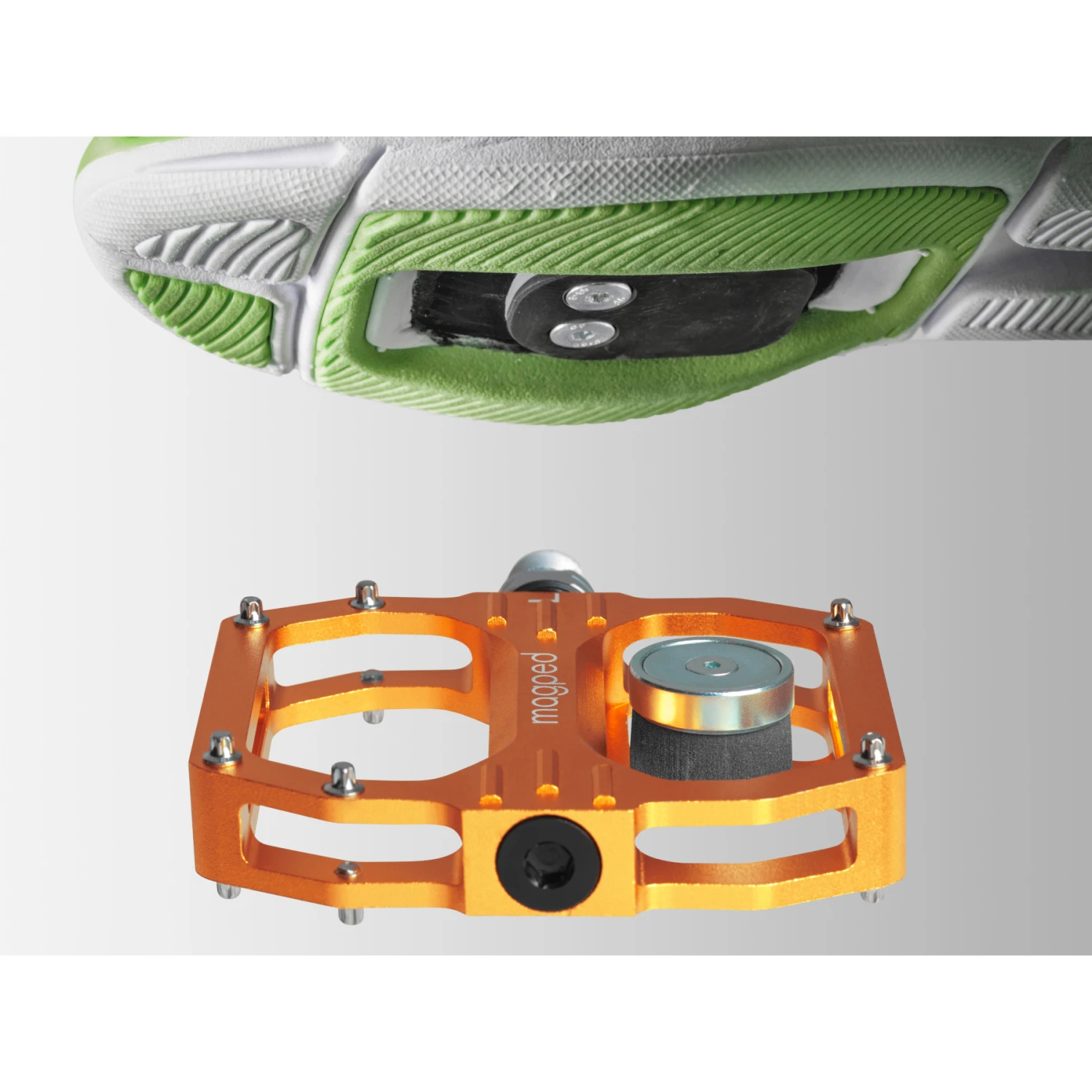 De schoenplaat van speciaal roestvrij staal kan met 2 schroeven in enkele minuten op elke SPD-compatibele fietsschoen worden gemonteerd. In tegenstelling tot andere systemen is vuil geen probleem voor de magped oplossing. Bovendien wordt het risico van struikelen tijdens het lopen verminderd en het loopcomfort sterk verbeterd.