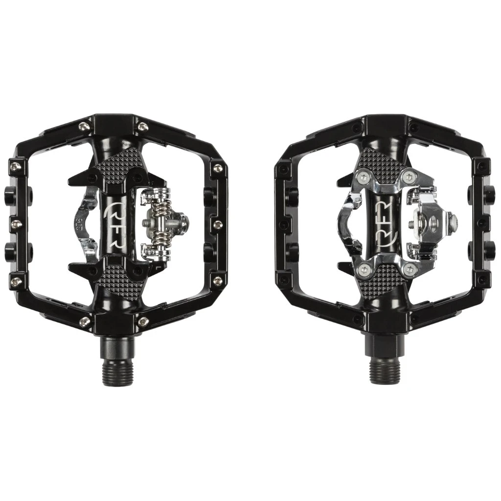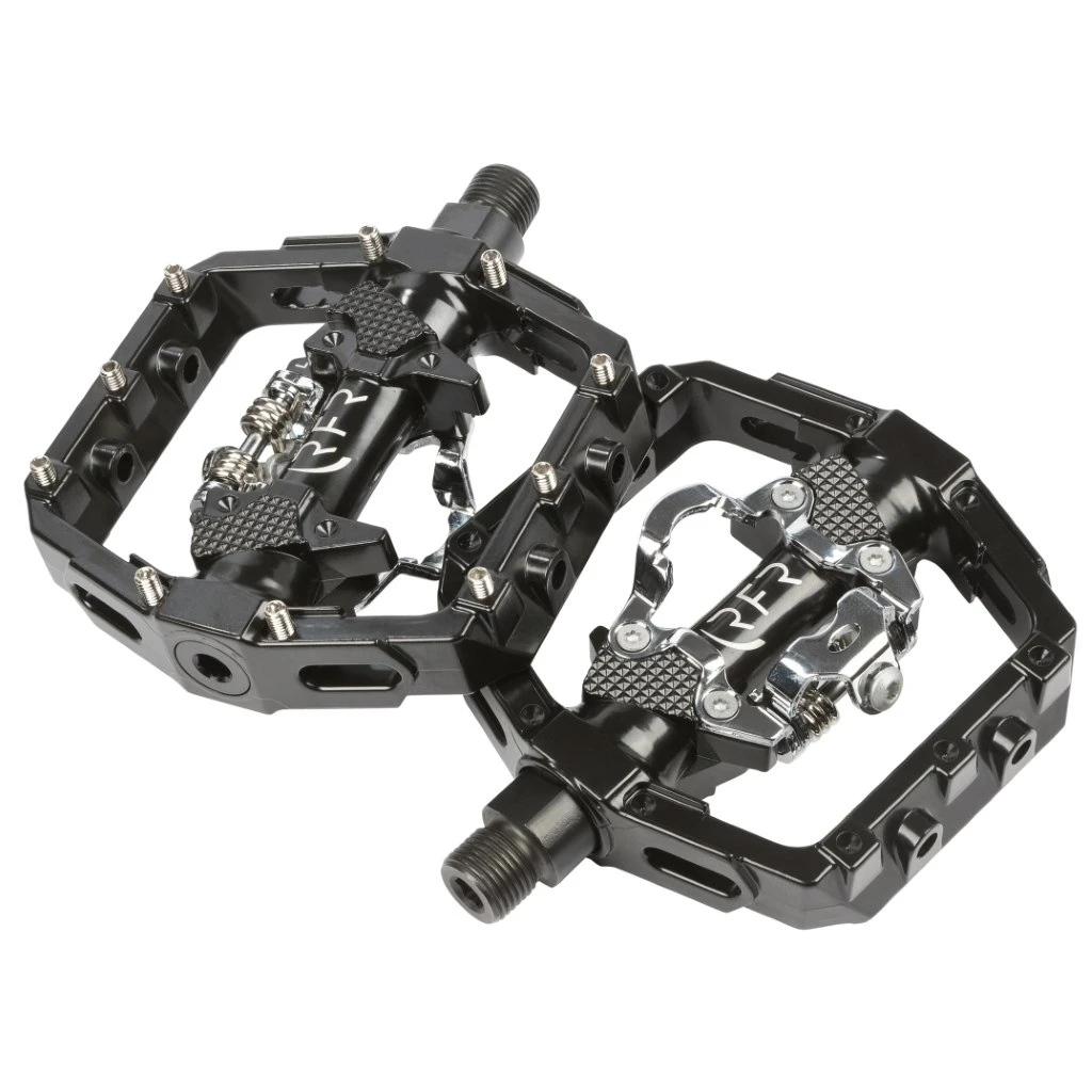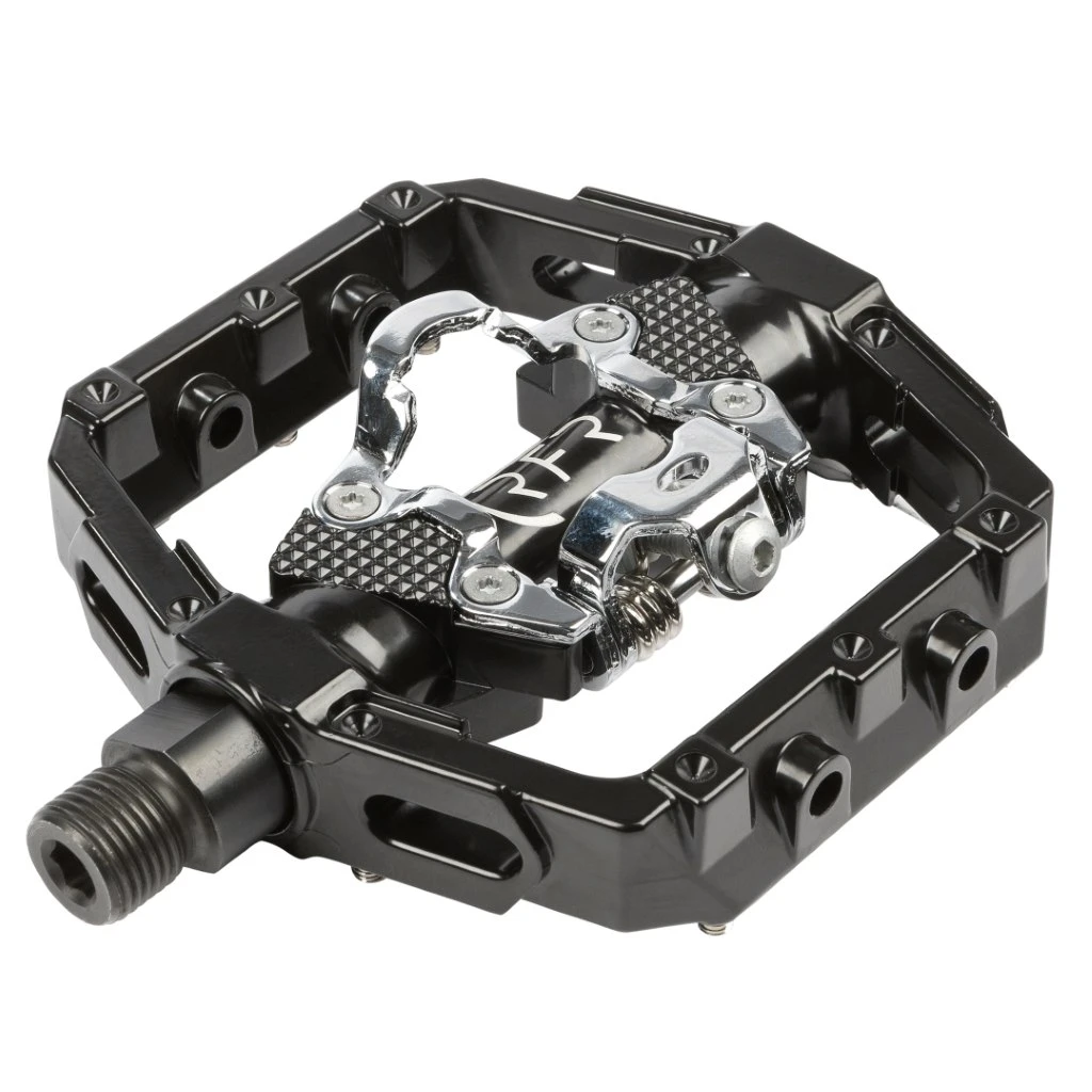 Het vlakke pedaal met kliksysteem is SPD-compatibel en gemonteerd op een Cr-Mo as. De antislip pinnen zijn vervangbaar en bieden de beste grip op de fiets. Door de hoogwaardige lagers en materialen zijn de pedalen zeer robuust en duurzaam.