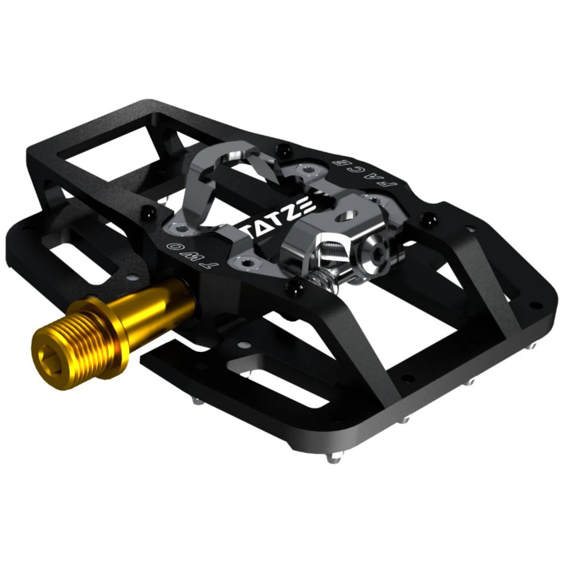 De Tatze TWO-FACE is tegelijkertijd een vlakke pedaal en een efficiënte clipless pedaal. 14 pinnen met gerichte verkanting zorgen voor enorme grip, maar ook aan de klikzijde zorgen vier in hoogte verstelbare pinnen voor een bijzonder rijke verbinding tussen pedaal en schoen. Voor een optimale bodemvrijheid is de vlakke zijde 2,5° gedraaid ten opzichte van de klikzijde, waardoor de bodemvrijheid op de cruciale punten met 5 mm toeneemt.